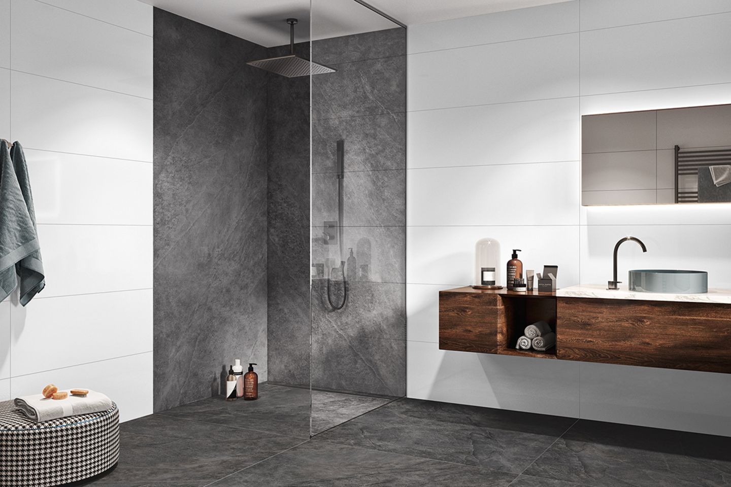 - Großformatige Fliesen in Weiß und Grau